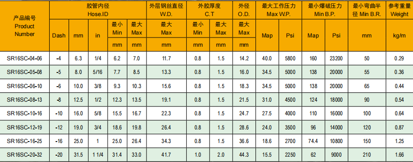 應(yīng)用:較小彎曲半徑的高壓液壓油基和水基液壓系統(tǒng)。優(yōu)異的脈沖和超過(guò) SAE100R2 和 SAE100R16 標(biāo)準(zhǔn)要求的彎曲性能。膠管擁有更加緊湊的尺寸和較小的彎曲半徑 2SN 膠管在機(jī)械裝配上有更好的性能。