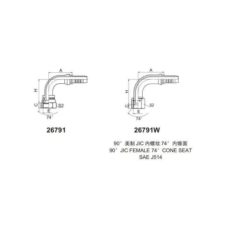 扣壓式接頭 26791和26791-W 90°美制JIC內(nèi)螺紋 74°內(nèi)錐面